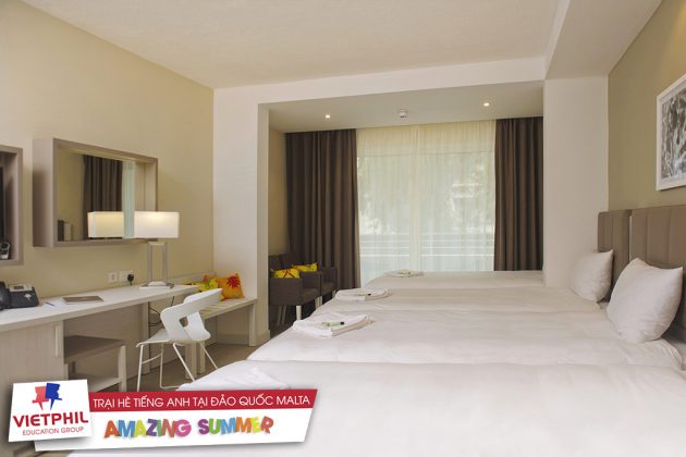 - Các con sẽ được ở phòng với 3 hoặc 4 người tại tầng 1, tầng 2 và tầng 3 của khách sạn với học sinh khác có cùng độ tuổi và cùng giới tính nhưng đảm bảo việc đa dạng hóa quốc tịch. Phòng ở bao gồm: Phòng tắm sang trọng, điều hòa, TV, máy sấy tóc, két sắt, tủ lạnh.